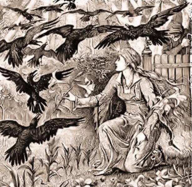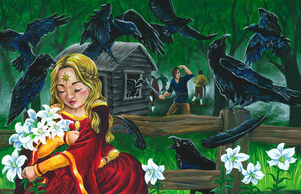 This is one of my favorite story types and includes a number of variants, including The Six Swans, The Twelve Wild Ducks, Udea and her Seven Brothers, The Wild Swans, The Seven Ravens, and The Magic Swan Geese. This particular version was told to the Grimm brothers by Julia and Charlotte Ramus and included in the first edition of their tales.