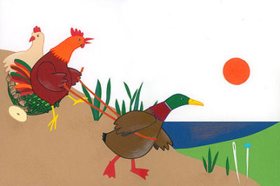 Later that evening they came to an inn, and since they didn’t want to travel any farther, and since the duck was not walking well but swayed from side to side, they decided to stop there. At first the innkeeper raised a lot of objections and said his inn was already full. Moreover, he thought they were not a very distinguished-looking group. However, they used some sweet talk and offered him the egg that the hen had laid along the way and told him that he could also keep the duck, who laid an egg a day. So finally he relented and said they could spend the night. Now they ordered some good hot food and had a merry time of it.