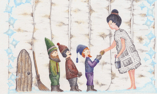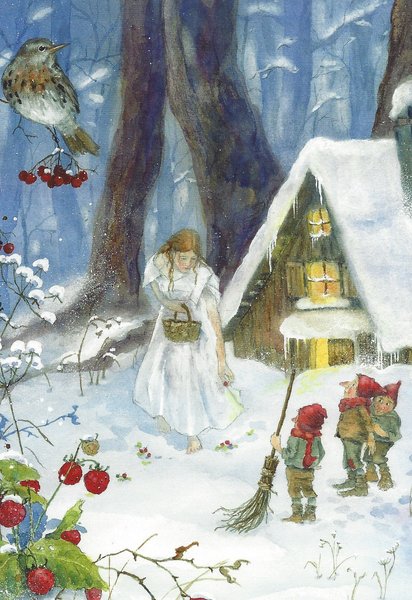 One day, in the middle of winter, when the snow was high, the stepmother sewed her a dress made of paper, and when it was finished, she called her stepdaughter to her and said, ‘I’ve got a craving to eat strawberries. So put on this dress, go into the forest, and fetch me a basket of strawberries. And don’t you dare return home until the basket is full.’