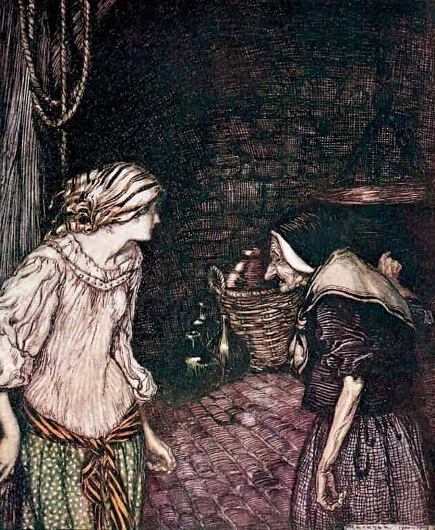 However, eventually, she feels that she has run out of excuses and so she sets off. The prince has helpfully tied ribbons to trees as a way to guide her through this ridiculous forest, which takes an entire day to traverse. She finds a large house at the end of this journey and an old woman waiting outside the door.