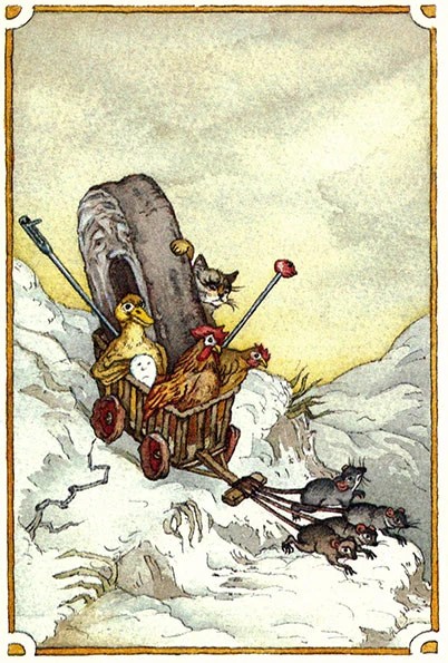 The little mice pulled the wagon into the barn. The little hen and the little rooster flew up on a perch. The cat settled down on the hearth. The duck took a place by the well sweep. The egg wrapped itself in a towel. The pin stuck itself in a chair cushion. The sewing needle jumped on the bed right into the pillow. And the millstone climbed to the top of the door.